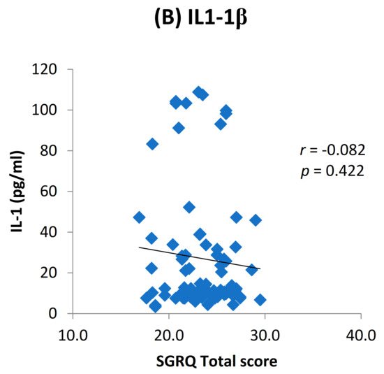 Figure 7. Correlation between St George Respiratory Questionanire (SGRQ) total score and levels of (A) TNF-α (pg/mL) and (B) IL-1β (pg/mL) among the cases.