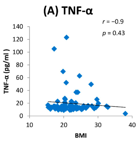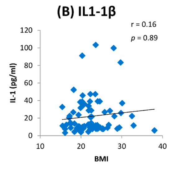 Figure 8. Correlation between SGRQ total score and levels of (A) TNF-α (pg/mL) and (B) IL-1β (pg/mL) among the cases. BMI: Body mass index.