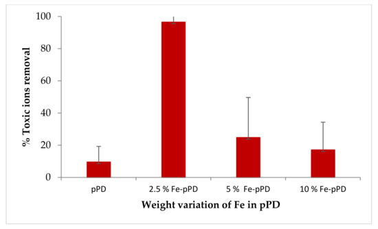 Figure 1 shows the adsorption capacities of the chemical species by varying the weight percentages of the synthesized materials with initial concentrations of 10 mg/L (F−) and 5 mg/L (As3+), a material dosage of 0.4 g at room temperature with a contact time 30 min at a shaking speed of 250 rpm. The respective sorption experiment was carried out by observing the effects of weight variation (v/v%) of Fe in the pPD matrix (2.5, 5, and 10%) compared with the bare pPD.