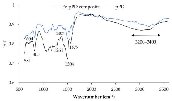 The FTIR spectra of the Fe-pPD composite were analyzed to determine the functional groups and any transition within the composite spectrum due to the incorporation of Fe metal oxide. Figure 2 shows the FTIR spectra of pPD and Fe-pPD composite with their respective peaks. The pPD spectrum shows a typical broad band between 3200 and 3400 cm−1 attributed to the presence of stretching vibration of N-H group and hydroxyl group (-OH) stretching from physically adsorbed H-O-H bonded to the surface [26,39]. The appearances of strong peaks at 1677 and 1504 cm−1 relate to the C=C and C=N stretching vibrations of the phenazine ring [40]. The C-N-C stretching vibrations of benzenoid and quinoid imine units are recognized by the peaks at 1407 and 1261 cm−1 with the characteristic of C-H out-of-plane bending vibrations of benzene bases in the phenazine skeletons, which are the bands at 805 and 581 cm−1 respectively [41]. Weak vibrations at ~604 cm−1 are typical of Fe-O bonding across the polymer composite.