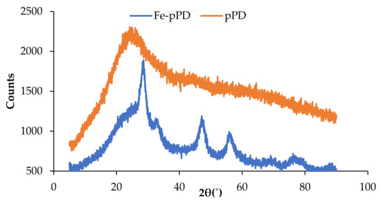The structural phases of the bare pPD and Fe-doped pPD composite are shown in Figure 4. The X-ray diffractogram of bare pPD shows a large, broad diffraction peak around 25°, signifying the amorphous nature of pPD synthesized by the oxidative polymerization process. A similar morphological phase of the bare pPD was reported elsewhere [43]. The transformation from the amorphous state exhibited by the bare pPD network to the crystalline form of Fe-doped pPD composite was affirmed by the emergence of four distinct new peaks (2θ = 28.9°, 33.65°, 48.5°, and 57.9°). The diffraction peak patterns of Fe oxides were indexed to 33.65° and 58.65°, which were the typical peaks associated with two-line magnetite (ICDD database).