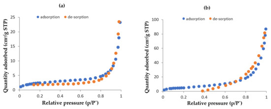 BET adsorption and desorption plots of (a) bare pPD and (b) Fe-pPD.