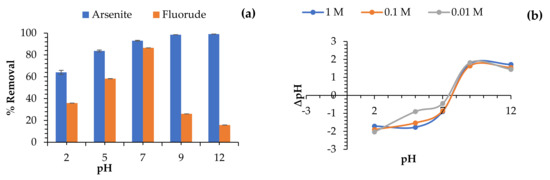 As revealed on the plot (Figure 11a), it was observed that As3+ uptake by the Fe-pPd composite increased with increasing the solution pH. From the obtained results, the optimal As3+ removal pH was reported to be 9. Relatively, an increase in As3+ removal is due to electrostatic attraction, which is attributed to an increase in OH− ions in the sorbent-sorbate solution and ion exchange between the adsorbent surface charges and adsorbates charges at pH above the pHpzc. The low As3+ uptake at the acidic region is due to the force of repulsion between the sorbent surface and pollutant ions charges as well as the competition between the hydrogen ions and As3+ ions. Recently, it has been reported that As3+ is an oxy ion that speciates at different pH under reducing and oxidizing conditions. Due to the speciation of arsenite in solution, at pH > 9 As3+ occurs as neutrally charged and negatively charged at pH < 9 [45]. Hence, there is less repulsion force aiding to a steady increase in its removal by the composite.