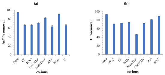 (a,b) Effect of co-existing ions plots for As3+ and F− (initial F− and As3+ concentration: 5 and 10 mg/L respectively; adsorbent dose: 0.25 and 0.2 g; solution volume: 50 mL; contact time: 24 h; shaking speed: 250 rpm; and temperature: 297 K).
