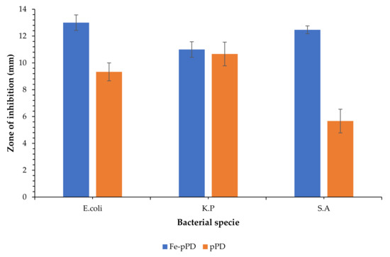The antimicrobial activities of pPD and Fe-pPD composites against Escherichia coli (E. coli), Klebsiella pneumonia (K.P), and Staphylococcus aureus (S.A) are displayed in Figure 14. Comparatively, bare pPD inhibited about 9, 10, and 6 mm, whereas the modified Fe-pPD composite inhibited about, 13, 11, and 12.5 mm. Thus, the modified composite has more susceptibility towards the concerned pathogens compared to bare pPD. The antimicrobial property of the synthesized adsorbent might be due to the existence of co-coordinatively unsaturated Fe metal of the composite material, which generates reactive oxidative species to assist cellular distraction and cell death [47]. Furthermore, different functional groups, especially the amines, within the Fe-pPD composite are also responsible for the denaturation of cell membrane proteins that ultimately lead to a breakdown of the cellular structure of the bacteria [48]. Additionally, the interaction between the negatively charged substances of the microbial cell surface and the positively charged surface of the adsorbent exhibits cell wall lysis [49]. Hence, the composites have high antimicrobial action towards Gram-negative bacteria, compared to Gram-positive ones, as confirmed by the attained results.