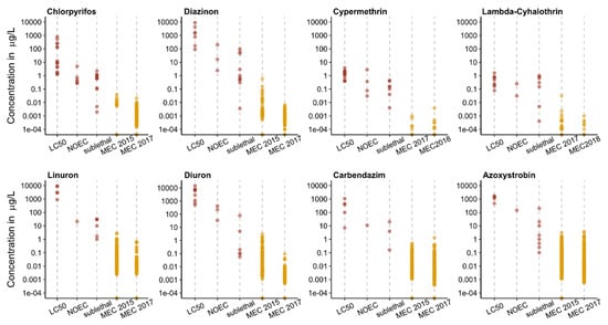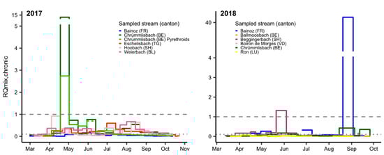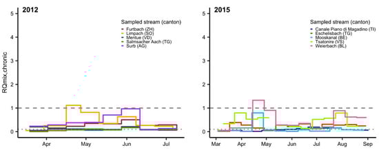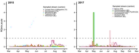 - Spycher, S.; Mangold, S.; Doppler, T.; Junghans, M.; Wittmer, I.; Stamm, C.; Singer, H. Pesticide risks in small streams: How to get as close as possible to the stress imposed on aquatic organisms. Environ. Sci. Technol. 2018, 52, 4526–4535. [Google Scholar] [CrossRef]
