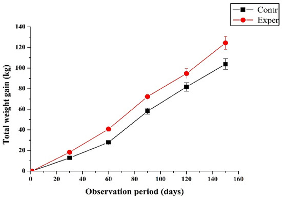 The body weight gain increased in comparison with the control animals at the end of the first month of the experiment by 5.89 kg (7.37%); by the end of the milk period (60 days), by 14.43 kg (9.76%). By the end of the study (150 days), the calves of the experimental group surpassed the animals of the control in live weight by 22.0 kg, or 12.9%, and in total weight gain by 20.6 kg, or 19.8%.