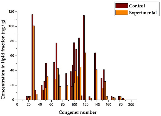 The data in Table 4 indicate that the total concentration of PCBs in the lipid fraction of the blood of calves from the experimental group (622 ng/g) is significantly lower than in calves from the control group (1038 ng/g). This may indicate that, as a result of the use of POPSH, the total load and pressure of PCBs on the physiological systems of the heifers of the experimental group decreased. Table 4 shows that, for 7 out of 33 congeners, the concentrations in the control and experimental groups differ insignificantly, but for the majority of congeners (n = 26) and for the total concentrations of PCB congeners in these groups, the differences are statistically significant at the p < 0.05 level. In Figure 2, the data on the concentrations of PCB congeners in the blood of calves are presented graphically.