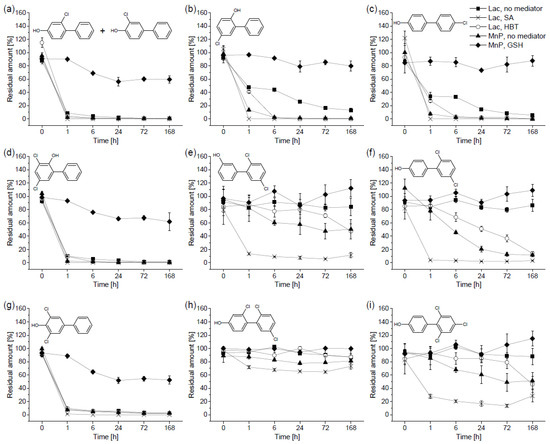 Residual amounts (related to corresponding heat-deactivated controls) of hydroxylated polychlorinated biphenyls (OH-PCBs) obtained during the in vitro experiment with the extracellular liquid of Pleurotus ostreatus: (a) 4-hydroxy-2-chlorobiphenyl and 4-hydroxy-3-chlorobiphenyl; (b) 2-hydroxy-5-chlorobiphenyl; (c) 4-hydroxy-4’-chlorobiphenyl; (d) 2-hydroxy-3,5-dichlorobiphenyl; (e) 3-hydroxy-2’,5’-dichlorobiphenyl; (f) 4-hydroxy-2’,5’-dichlorobiphenyl; (g) 4-hydroxy-3,5-dichlorobiphenyl; (h) 4-hydroxy-2,2’,5’-trichlorobiphenyl; and (i) 4-hydroxy-2’,4’,6’-trichlorobiphenyl. The OH-PCBs were incubated in a mixture; the initial concentration was 2 µg mL−1 for each. The initial enzyme activities were 450 U L−1 of laccase and 30 U L−1 of manganese-dependent peroxidase (MnP). The laccase-favouring setup (Lac) contained no mediator (◼), syringaldehyde (SA; ✕), or 1-hydroxybenzotriazole (HBT; ◯); the MnP-favouring setup contained no mediator (▲) or glutathione (GSH; ⯁).