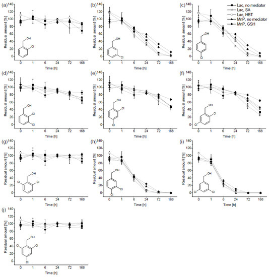 Residual amounts (related to corresponding heat-deactivated controls) of chlorobenzyl alcohols (CB-OHs) obtained during the in vitro experiment with the extracellular liquid of Pleurotus ostreatus: (a) 2-chlorobenzyl alcohol; (b) 3-chlorobenzyl alcohol; (c) 4-chlorobenzyl alcohol; (d) 2,3-dichlorobenzyl alcohol; (e) 2,4-dichlorobenzyl alcohol; (f) 2,5-dichlorobenzyl alcohol; (g) 2,6-dichlorobenzyl alcohol; (h) 3,4-dichlorobenzyl alcohol; (i) 3,5-dichlorobenzyl alcohol; and (j) 2,4,6-trichlorobenzyl alcohol. The CB-OHs were incubated in a mixture; the initial concentration was 2 µg mL−1 for each. The initial enzyme activities were 450 U L−1 of laccase and 30 U L−1 of manganese-dependent peroxidase (MnP). The laccase-favouring setup (Lac) contained no mediator (◼), syringaldehyde (SA; ✕), or 1-hydroxybenzotriazole (HBT; ◯); the MnP-favouring setup contained no mediator (▲) or glutathione (GSH; ⯁).
