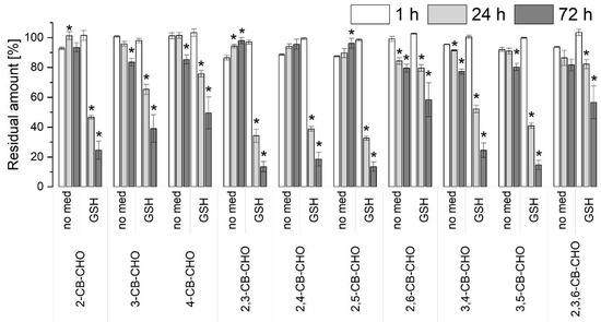 Residual amounts (related to corresponding heat-deactivated controls) of chlorobenzaldehydes (CB-CHOs) detected after incubation with the extracellular liquid of Irpex lacteus with no mediator (no med) or reduced glutathione (GSH): 2-chlorobenzaldehyde (2-CB-CHO); 3-chlorobenzaldehyde (3-CB-CHO); 4-chlorobenzaldehyde (4-CB-CHO); 2,3-dichlorobenzaldehyde (2,3-CB-CHO); 2,4-dichlorobenzaldehyde (2,4-CB-CHO); 2,5-dichlorobenzaldehyde (2,5-CB-CHO); 2,6-dichlorobenzaldehyde (2,6-CB-CHO); 3,4-dichlorobenzaldehyde (3,4-CB-CHO); 3,5-dichlorobenzaldehyde (3,5-CB-CHO); and 2,3,6-trichlorobenzaldehyde (2,3,6-CB-CHO). The CB-CHOs were incubated in a mixture; the initial concentration was 2 µg mL−1 for each. The initial enzyme activities were 706 U L−1 of manganese-dependent peroxidase and 114 U L−1 of manganese-independent peroxidase. The asterisks denote where significant (p-value < 0.05) differences were found between 1 h and 24 h or between 1 h and 72 h (ANOVA and Tukey’s range test).