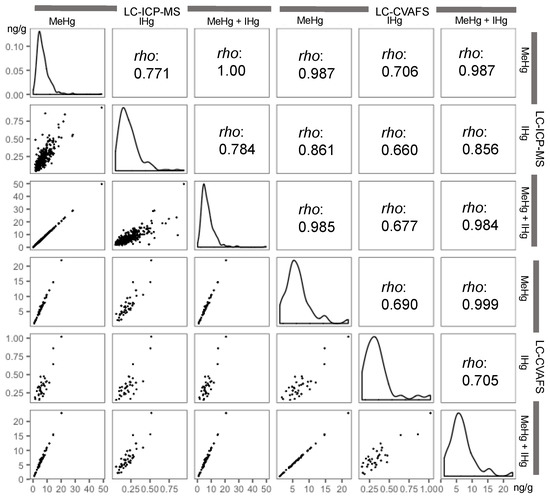 Correlation matrix plots between mercury concentrations (ng/g) in cord blood determined by LC-ICP-MS and LC-CVAFS. Correlation matrix plots show the distribution, ‘rho’ of Spearman’s correlation coefficients, and scatter plots. LC-ICP-MS: liquid chromatography-inductively coupled plasma mass spectrometry, LC-CVAFS: liquid chromatography-cold vapor atomic fluorescence spectrometry. The plots of more than method detection limit are shown.