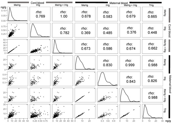 Correlation matrix plots between mercury concentrations (ng/g) in cord blood and maternal blood. Correlation matrix plots show the distribution, ‘rho’ of Spearman’s correlation coeffi-cients, and scatter plots. LC-ICP-MS: liquid chromatography-inductively coupled plasma mass spectrometry. Mercury speciation results obtained by LC-ICP-MS are shown as methylmercury (MeHg), inorganic mercury (IHg), and the sum (MeHg + IHg). Total mercury (THg) results ob-tained by ICP-MS are showed as THg. The plots of more than method detection limit are shown.