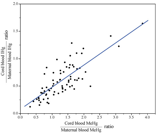 Figure 4 shows the relationships between the cord blood:maternal blood ratios of IHg and MeHg. The median (25th–75th percentile) ratios of MeHg and IHg were 1.3 (0.8–1.6) and 0.5 (0.4–0.8), respectively. The cord blood:maternal blood ratio of IHg was positively associated with that of MeHg.