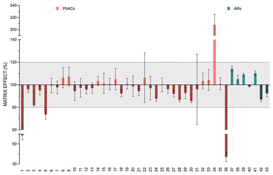Matrix effect of the ARs and PhACs in the soil used for the validation process. Bars represent the mean recoveries and the SD of the 43 analytes. PhACs (orange) and ARs (green) are presented according to their number in Table 1. The suppression has been indicated with an oblique dashed pattern.