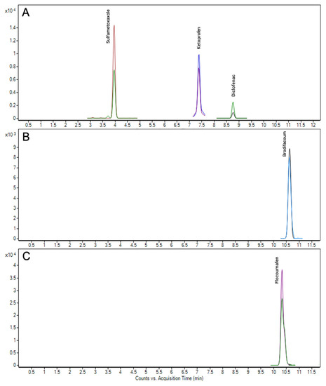 The seven target rodenticides, chloramphenicol, tolfenamic acid, and the P-IS coumachlor were determined in negative mode with precursor ions corresponding to [M − H]−. The remaining analytes and P-IS were analyzed in positive mode using precursor ions corresponding to [M + H]+ except for cefuroxime axetil, cloxacillin, eprinomectin, josamycin and penicillin V. It is known that, together with the protonated and deprotonated molecules already mentioned, the ionization process can produce a variety of adduct ions depending on the composition and concentration of mobile-phase additives and analytes, the pH, the mobile-phase flow rate, the temperature or even solvent impurities and glassware [63,64,65]. While cefuroxime axetil formed a sodium adduct [M + Na]+, cloxacillin, josamycin and penicillin V formed methanol adducts, which was the organic phase solvent. In the case of eprinomectin, the ion m/z 878 selected as parental for both transitions is its protonated derivative ion resulting from dehydrative aromatization [66]. In the case of brodifacoum and bromadiolone, which have Br in their chemical structures, an element with an abundant characteristic isotope distribution, transitions corresponding to 79Br and 81Br were selected. In the same way, chloramphenicol, which has two atoms of Cl in its structure, was optimized selecting the transitions corresponding to 35Cl and 37Cl. The transitions were chosen in terms of selectivity and sensitivity, selecting the most abundant ones for quantification proposals.