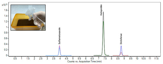 Thus, we decided to investigate whether the soil could accumulate these compounds during irrigation. First, we prepared a pool with the water samples collected during four consecutive days and concentrated it ten times with the intention of achieving a concentration much higher that the LOQ of the three compounds detected. This was performed using a vacuum concentrator RVC 2-25 CD plus (Christ, Germany) at 35 °C and then reconstituting the sample in a volume 10 times lower of ultrapure water. After that, an irrigation simulation model was prepared with the soil used for the validation procedure. Approximately 500 g of soil was placed in a tray container and irrigated with 0.5 L of the concentrated water solution on alternate days for two weeks (Figure 4, inset). Then, the soil was left to air dry for two weeks, homogenized and extracted using the proposed method. Finally, both the concentrated water and the extract were analyzed. Diclofenac ketoprofen and sulfamethoxazole were extracted with an extraction efficiency of 93.4, 85.1, and 107.2%. Therefore, the soil is capable of accumulating these compounds in irrigation if the concentration is higher. A chromatogram of the irrigated soil together with an image of the experiment can be seen in Figure 4.