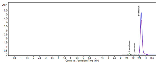 Finally, we tested the validity of the method in another scenario within the context of a judicial forensic investigation. We had dealt with soil samples from a protected natural area on the island of Gran Canaria (Canary Islands, Spain) where the skeletonized remains of several protected birds (ancient corpses) were found. There were strong suspicions that a bait containing some type of poison had been maliciously placed. Therefore, several samples collected in the area were submitted, including a soil sample taken from underneath one of the corpses of a medium-sized bird of prey. This soil sample was analyzed with the method proposed in this article, and as shown in Figure 5, three ARs were identified: brodifacoum, bromadiolone and difenacoum at 223.62, 12.61 and 1.94 ng g−1, respectively.