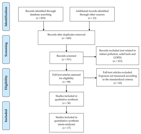 In this study we reported the association between indoor pollution and COPD in south Asia, including studies published until mid-2020. The present systematic review and meta-analysis reexamines existing research findings about the association between indoor pollution and COPD deaths in South Asian countries. A total of 17 individual studies were analyzed based on the specific inclusion and exclusion criteria from MEDLINE and PUBMED from 1985 to 30 June 2020. Based on 11 Prospective controlled or non-controlled trials conducted in Southern Asia/Asia and 6 Retrospective studies, this systematic review provides a confirmation that exposure to indoor pollution is related to COPD deaths and prevalence. Most of the studies confirmed that women were more prone to COPD than men with a reported odds ratio of 1.32 [27,28,30]. The studies conducted in various regions of south Asia confirmed that low economic background in some developing countries was one of the main reasons for COPD [31,32]. A study done by Qureshi et al. concluded that indoor pollution like biomass and solid fuels had significant impact on COPD deaths with an odds ratio of 2.0. Risk was relatively higher in rural areas than urban areas (OR = 2.0) [23].