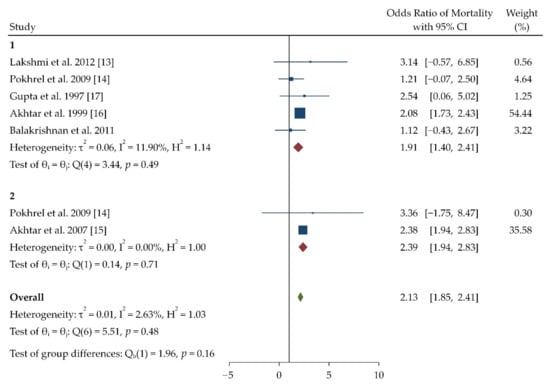 The forest plot generated for COPD mortality (Figure 2) presents the overall odds ratio and heterogeneity in the studies included for meta-analysis. Two studies, i.e., Akthar et al. in 2007 and in 1999, were found to have higher weightage than other studies (35.58 and 54.55), respectively. The overall heterogeneity observed was 0.01 and 2.63%. The indoor pollutant biomass had the highest weightage according to the study done by Akthar et al. in 1999 [15,16].