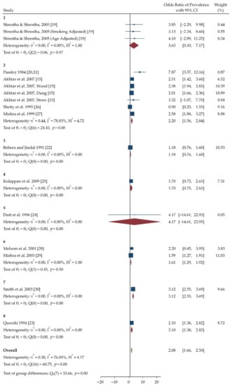 This paper gathers 17 papers with different results. The publication research period ranged from 1985 to 2020, representing almost 35 years. In comparison with other previous meta-analysis and systematic reviews, this review had 3 additional papers and results, including studies of Akhtar, Kolappan, and Balakrishnan et al. [15,18,25]. These studies provided a broad risk level analysis about the relation between indoor pollution and COPD. Pathak et al. [48] performed a systematic review in 2020 which is the latest one, drawing association between indoor pollution from biomass cooking and COPD. The review included global regions of Africa, Asia, Europe, North and South America, in which Asian region showed an odds ratio of 2.88 and the review concluded biomass to be associated with COPD. The review considered the whole of Asia rather than segregating the Asian countries. Evaluation of the results was also broad and diversified in this review.