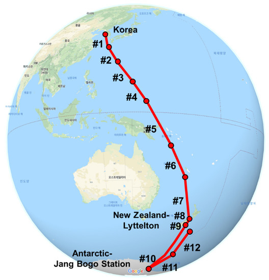 Sampling route taken by the Ice Breaking Research Vessel (IBRV) Araon from Incheon to the Antarctic Jang Bogo Station for the period of 2018.10.31 to 2018.12.14 (Map data: © 2020 Google, ORION-ME).