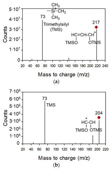 Product ion spectra of derivatized (a) arabinose (precursor ion: m/z 217), (b) levoglucosan (precursor ion: m/z 204), and (c) xylose (precursor ion: m/z 191).