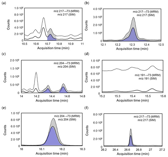As discussed in Section 3.1, due to the lower baseline, the MDLs of GC-MS/MS for the target saccharides were lower than those of GC-MS. The MDLs obtained using GC-MS/MS in MRM mode ranged from 1.38 pg/μL (mannose) to 11.7 pg/μL (sucrose), whereas those measured using GC-MS in SIM mode ranged from 5.57 pg/μL (mannose) to 31.37 pg/μL (sucrose). Thus, the MDLs of GC-MS/MS in MRM mode were between 2 (galactose) and 22 (mannose) times lower than those of GC-MS in SIM mode, as reported in Table 5. Because the MDLs of GC-MS were higher than those of GC-MS/MS, the minimum values in the linear ranges of GC-MS were generally higher than those of GC-MS/MS for target saccharides such as ribose, levoglucosan, xylose, mannose, glucose, and sucrose.