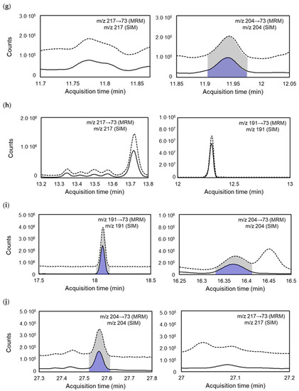 GC-MS analysis was conducted on a Hewlett Packard 7890A GC equipped with a 5975 mass-selective detector (Agilent Technologies, Santa Clara, CA, USA) in selected ion monitoring (SIM) mode. GC-MS/MS analysis was performed on an Agilent 7890B GC equipped with a 7010 mass-selective detector triple quadrupole MS system in multiple reaction monitoring (MRM) mode.