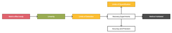 When extending the analytical scope of a method, it is necessary to perform a validation process to verify the ability of the assay to obtain satisfactory results for new analytes. In this work the validation process included the evaluation of linearity, accuracy, precision, calculation of limits of detection (LOD) and quantification (LOQ), and study of the matrix effect. There is no specific guidance for the validation of methods for the analysis of chemical contaminants in soil; therefore, we decided to follow the European Union guidelines for the analysis of pesticides in agricultural products [49,51]. A diagram summarizing the validation process is shown in Figure 1.