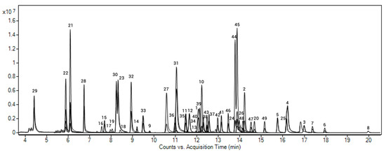 We decided to avoid the evaporation and solvent change steps and to inject the final extract as it was obtained (directly into acetonitrile), to avoid the loss of the more volatile compounds. Moreover, ACN has proven to be a good solvent for use in gas chromatography, as stated by Mastovska et al. [53] and from our own studies on pesticides of current or recent use in this matrix [46,47]. No optimization was performed regarding the chromatographic conditions (column and temperature program); being a scope extension, we cannot introduce changes to the original method because we would run the risk of modifying the conditions under which the 218 compounds included in that study were validated. Figure 2 shows the chromatogram of a blank soil sample spiked at 50 ng g−1 with the target analytes and P-IS in GC-MS/MS analysis.