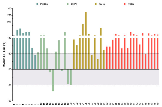 As can be seen, most of the compounds analyzed showed significant matrix effects, except for eight of them (PBDE 183, Endrin, Hexachlorocyclohexane (beta), Hexachlorocyclohexane (gamma-lindane), Mirex, Fluoranthene, Naphthalene, and PCB 157), which were within the limits established for a non-significant matrix effect. The most marked trend was enhancement, although five of the compounds, all of them OCPs, showed no significant to low significant suppression. More than half of the compounds (26 out of 49) had a matrix effect superior to 140%, with Benzo[b]fluoranthene having the highest matrix effect (281%). These data evidence the importance of evaluating the matrix effect in this equipment and the need to use matrix-matched calibration curves in routine analyses of POPs in soil samples.