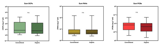 Comparative study of sums of organochlorine pesticides, polycyclic aromatic hydrocarbons, and polychlorinated biphenyls between farms of conventional production and those of organic production. The lines show the medians, the boxes cover the 25th to 75th percentiles, and the minimal and maximal values are shown by the ends of the bars.