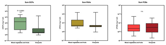 Comparative study of sums of organochlorine pesticides, polycyclic aromatic hydrocarbons, and polychlorinated biphenyls between farms devoted to the production of mixed vegetables and vineyards. The lines show the medians, the boxes cover the 25th to 75th percentiles, and the minimal and maximal values are shown by the ends of the bars.