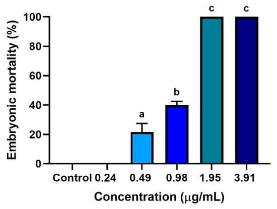 Embryotoxicity was evaluated at five different concentrations of ZO essential oil (3.91, 1.95, 0.98, 0.49, and 0.24 µg/mL). Coagulation and the absence of heartbeat in zebrafish embryos were indicative of mortality [4]. The results showed that the toxic effect of ZO essential oil appeared to occur in a concentration-dependent manner. The mean mortality of zebrafish at 96 hpf is shown in Figure 2. The lowest dose of ZO essential oil (0.24 µg/mL) and 0.1% DMSO (control) caused no mortality in the zebrafish embryos. By contrast, a significantly increased mortality rate (p < 0.05) was observed in zebrafish embryos exposed to 0.49, 0.98, 1.95, and 3.91 µg/mL of ZO essential oil, when compared with the lowest concentration of ZO essential oil (0.24 µg/mL). No viable zebrafish embryos were observed in the groups treated with 1.95 and 3.91 µg/mL ZO essential oil. The LC50 value of ZO essential oil was 1.003 µg/mL.