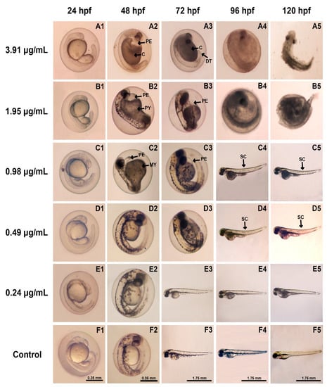 Morphological characteristics of zebrafish embryos and larvae treated with different concentrations of ZO essential oil or vehicle at different time points (24–120 hpf). Normal morphology was found in the group treated with the lowest concentrations and with vehicle (E,F). Typical malformations of zebrafish development were observed in embryos that had received ZO essential oil at a dose of 0.49–3.91 µg/mL (A–D). Abbreviations: PE, pericardial sac edema; C, coagulation; DT, dented tail; PY, poor reabsorption of yolk sac; MY, malformation of yolk sac; SC, spinal curvature.