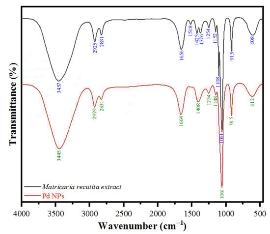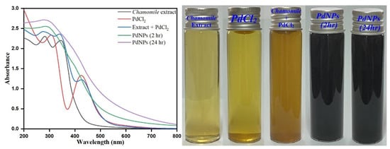3.1. UV-Visible Spectroscopic Analysis of M. recutita Flower Extract and PdNPs