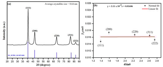 | Peak Position 2θ (Degree) | hkl | βT FWHM | d-Spacing (Å) | Crystallite Size d (nm) | Dislocation Density δ × 10−3 (nm−2) | Micro-Strain ε × 10−3 |