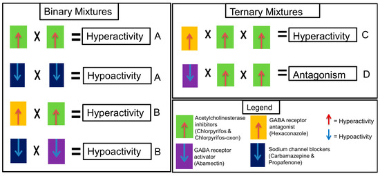 | Mixture D | Chlorpyrifos, hexaconazole and abamectin | Hyper and Hypoactivity | 0.34:0.64 :0.02 | 0, 1.25, 2.5, 5 0, 1, 2, 4 | - * | - | - |