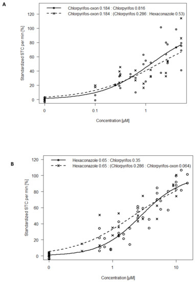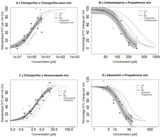 - Drescher, K.; Boedeker, W. Assessment of the Combined Effects of Substances: The Relationship between Concentration Addition and Independent Action. Biometrics 1995, 51, 716–730. [Google Scholar] [CrossRef]
