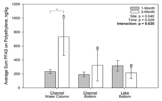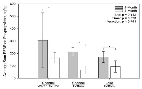 Average Sum of 7 PFAS (ng/kg) for Polypropylene Deployed in Muskegon Lake, MI. Asterisks indicate statistically significant differences between the 1 month vs. 3 month incubation at a specific site.