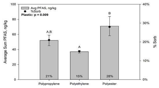 Data Analysis—Laboratory Study: Summed PFAS concentrations (PFHxA, PFHpA, and PFOA) were analyzed using 1-way ANOVA to determine whether plastic type (polypropylene, polyethylene, polyester) influenced final microplastic PFAS concentrations. Each microplastic type had n = 3 independent sample replicates. Assumptions of normality and variance were tested as described above and detected no violations and data were not transformed. Post hoc multiple comparison was completed using a Tukey test. All statistical analyses were completed using Sigma Plot (v14.0).