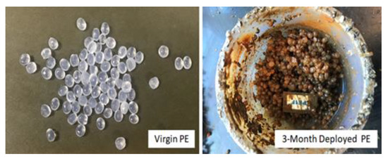 The adsorption of PFAS was much greater in the field-incubated plastic than what was observed in the laboratory with plastic and water alone. Figure 7 displays images of polyethylene before and after field deployment (3-month). As shown, the deployed materials when retrieved had a great deal of organic matter and biofilm associated with them, particularly bacteria from the Burkholderiales, Rhodocyclaceae, Comamonadaceae, and Pseudomonadaceae [27]. Previous work has shown that PFASs prefer adsorption to lipids rather than being freely dissolved in water alone [35]. Furthermore, because the biofilm and organic matter accumulation on these materials is heterogenous, this is consistent with the large variability observed in the duplicate PFASs results associated with the same plastic types, locations, and durations reported in the present study. Therefore, the greater degree of PFAS adsorption observed in the field-deployed samples is most likely due to secondary adsorption of these compounds to the plastic-associated organic matter. This is consistent with the findings of Ateia et al. [36], who found that microplastics that were incubated with the natural organic matter had increased uptake of PFOA and PFOS compared to non-incubated microplastics, presumably due to an organic matter formation and/or co-sorption. The role of the biofilm, including the functional roles and adsorptive capacities of its taxonomic composition, is an area in need of additional research [34].