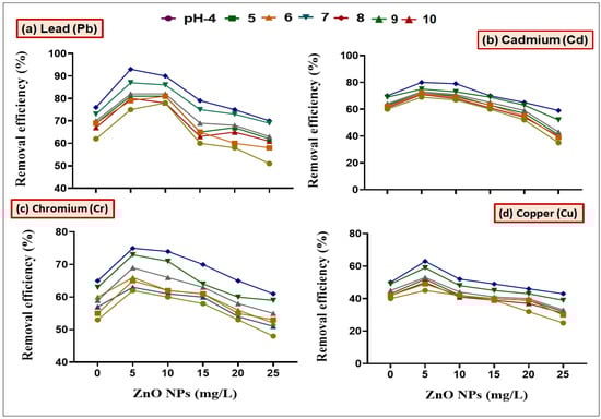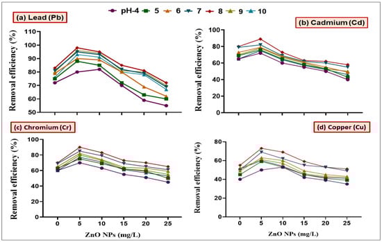 Synergistic effect of L. macroides and ZnO NPs (5, 10, 15, 20 and 25 mg/L) on the removal efficiency of (a) Lead (Pb), (b) Cadmium (Cd), (c) Chromium (Cr) and (d) Copper from the media amended with heavy metal at different pH (4, 5, 6, 7, 8, 9 and 10).