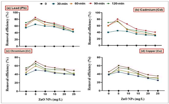Synergistic effect of B. cereus and ZnO NPs (5, 10, 15, 20 and 25 mg/L) on the removal efficiency of (a) Lead (Pb), (b) Cadmium (Cd), (c) Chromium (Cr) and (d) Copper from the media amended with heavy metal at different time intervals (0, 30, 60, 90 and 120 min).