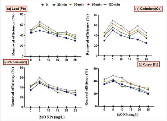 It was observed from the current findings that the removal efficiency of combined treatment of bacteria and ZnO NPs (5 mg/L) was maximum at neutral pH (Figure 1 and Figure 2). This is in agreement with previous observations, where it has been shown that neutral pH condition made the surface of ZnO NPs more negative; thus electrostatic interactions between NPs and metal cations increased, which caused higher removal efficiency, while at low pH, HMs precipitate in the form of hydroxides where hydrogen ions compete for binding with adsorbents. These results were confirmed by the findings of Xie [39] that the hydroxide ions on the functional group of NPs react with hydrous oxide at higher pH to produce deprotonated oxide (MO−), while at lower pH, the hydrous surface will be completely covered with hydrogen ions [14]. The synergistic effect is more helpful in remediating the Pb and Cu metals from polluted water. It was reported by Karn [38] that ZnO nanoparticles showed 85% removal efficiency of Pb and Cu metal ions in the form of metal reduction/oxidation or adsorption mechanism. The removal efficiency of HMs was also observed at different time intervals (0, 30, 60, 90 and 120 min). Maximum removal efficiency of HMs was observed after a 90 min time interval (Figure 3 and Figure 4). It can be observed from the current findings that bacteria inoculation reduced the passage of metals in water, which results in low reactive oxygen species (ROS) in less time. These results were confirmed by the findings of Wang [40] that after 90 min maximum binding sites on NPs’ surface were exposed, which effectively bind with metals [41].