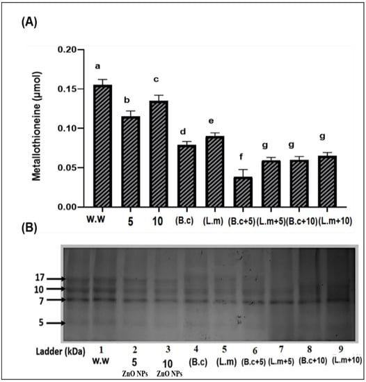 Synergistic effect of the bacterial strains (B. cereus and L. macroides) and ZnO NPs (5 and 10 mg/L) on Metallothioneins (MTs) contents (A) and concentration (B) of rice plants grown in HMs contaminated water. Lane 1: w.w (Waste water)., Lane 2: 5 mg/L ZnO NPs + w.w., Lane 3: 10 mg/L ZnO NPs + w.w., Lane 4: B.c +w.w, Lane 5: L.m + w.w., Lane 6: B.c. + 5 (B. cereus + 5 mg/L ZnO NPs + w.w.)., and Lane 7: L.m + 5 (L. macroides + 5 mg/L ZnONPs + w.w.), Lane 8: B.c. + 10 (B. cereus + 10 mg/L ZnO NPs +w.w.) and Lane 9: L.m. + 10 (L. macroides + 10 mg/L ZnO NPs + w.w.). Error bars show means of standard error (±S.E.) of three replicates (n = 3) showing statistical significance at 5% probability level (ANOVA). Different alphabets appeared in superscript on each number showed statistically significant at 5% probability level.