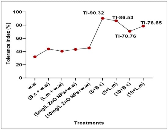 The tolerance index was decreased in plants grown in polluted water (32.102%) while increased in plants grown after synergistic treatment with bacteria and NPs (Figure 8). However, as expected, maximum tolerance index was observed in the plants grown in polluted water containing 5 mg/L ZnO NPs raised from seeds primed with B. cereus (90.32%) and L. macroides (86.54%) as compared with individual treatments of B. cereus (43.86%) and L. macroides (40.52%) without ZnO NPs.
