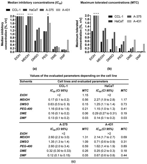 Figure 1a,b illustrates a graphical comparison of the four cell lines regarding the IC50 values and MTC of the solvents, respectively, whereas the values are presented as numbers in Figure 1c. The IC50 of the solvents varied from 0.12 to >2% v/v and the MTCs were in the range of 0.03 to >2% v/v (Figure 1). The IC50 values of EtOH were not calculated, as this solvent did not influence the proliferation of the four tested cell lines up to a concentration of 2% volume fraction, except for CCL-1. The MTC of EtOH leading to less than 30% inhibition of this cell line proliferation was 1.15% v/v. The IC50 values greater than 2% v/v were calculated for MEtOH on HaCaT, A-375 and A-431 cells and for PEG-400 on A-375 cells. The solvents showing IC50 values between 1 and 2% v/v were DMSO on HaCaT and A-375 and PEG-400 on CCL-1, HaCaT and A-435. DME and DMF showed IC50 values lower than 1% v/v for all four examined cell lines. The MTC values over 2% v/v were measured only for EtOH on HaCaT, A-375 and A-431. MEtOH was not cytotoxic in concentrations higher than 1% v/v for HaCaT and A-375 cell lines, whereas 1% DMSO was tolerable only for A-375 cells. All other solvents were tolerable in concentrations between 0.03% v/v (DMF on CCL-1 and HaCaT) and 0.89% v/v (PEG-400 on A-431). As expected, EtOH was the least cytotoxic solvent, with MTC and IC50 > 2% v/v determined on HaCaT, A-375 and A-431 cell lines. It was followed by MEtOH with MTCs ranging from 0.56 to 1.31% and IC50 0.17 to 2.60%. Next were DMSO and PEG-400, which exhibited similar toxicity—MTCs 0.15 to 1.09% and IC50 0.63 to 2.60%. The most toxic solvents were DME and DMF—their MTCs were in the range of 0.03–0.67% and IC50 varied in the interval 0.12–0.67%.