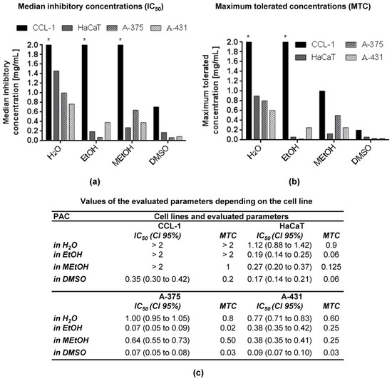 (a) IC50 and (b) MTC of six solvents expressed as % (v/v) of solvents on a panel of four cell lines after 72 h incubation; (c) numerical values of IC50 and MTC based on three independent assays (n = 3) and used in (a,b), respectively. Legend: IC50—median inhibitory concentration; MTC—maximum tolerated concentration; CI 95%—confidence interval 95%. Asterisks (*) denote that the IC50 or MTC values exceed the maximum tested concentration.